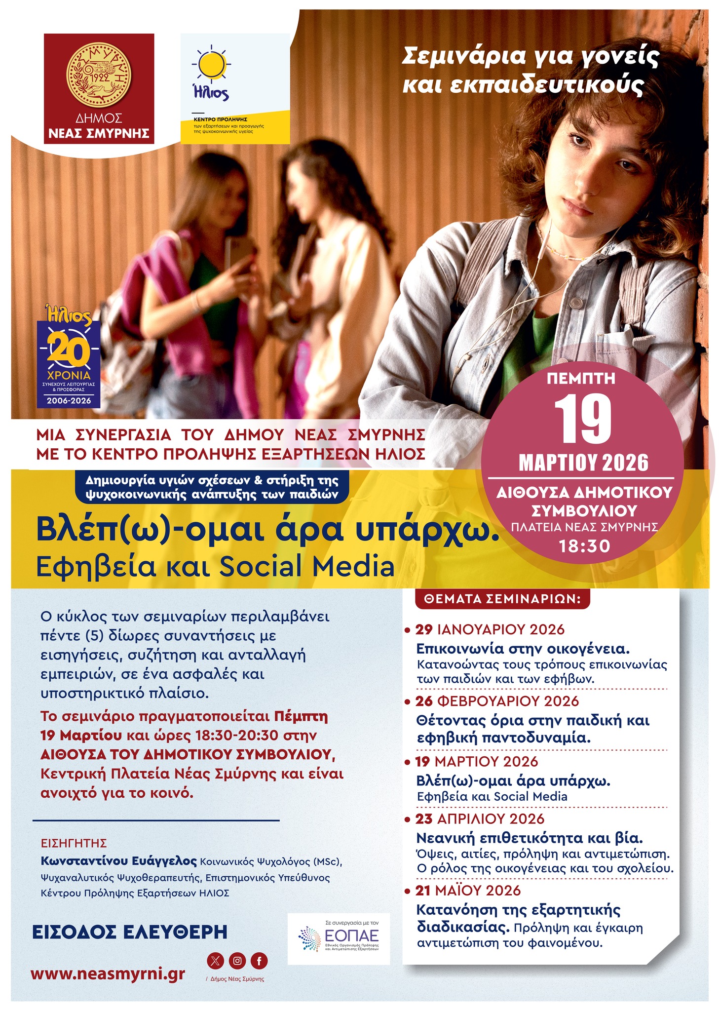 Το 3ο Σεμινάριο για Γονείς και Εκπαιδευτικούς με θέμα "Βλέπ(ω)-μαι άρα υπάρχω. Εφηβεία και Social Media" πραγματοποιείται την Πέμπτη 19 Μαρτίου ώρα 18:30 στην Αίθουσα Δημοτικού Συμβουλίου (2ας Μαϊου 8,