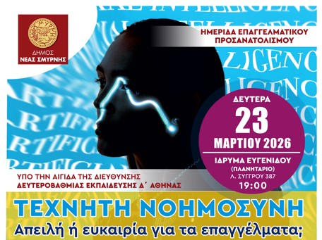 Ημερίδα Επαγγελματικού Προσανατολισμού με θέμα "Τεχνητή Νοημοσύνη. Απειλή ή ευκαιρία για τα επαγγέλματα;" διοργανώνει ο Δήμος Νέας Σμύρνης την Δευτέρα 23 Μαρτίου, ώρα 19:00 στο Ίδρυμα Ευγενίδου (Πλανητάριο), Συγγρού 387.