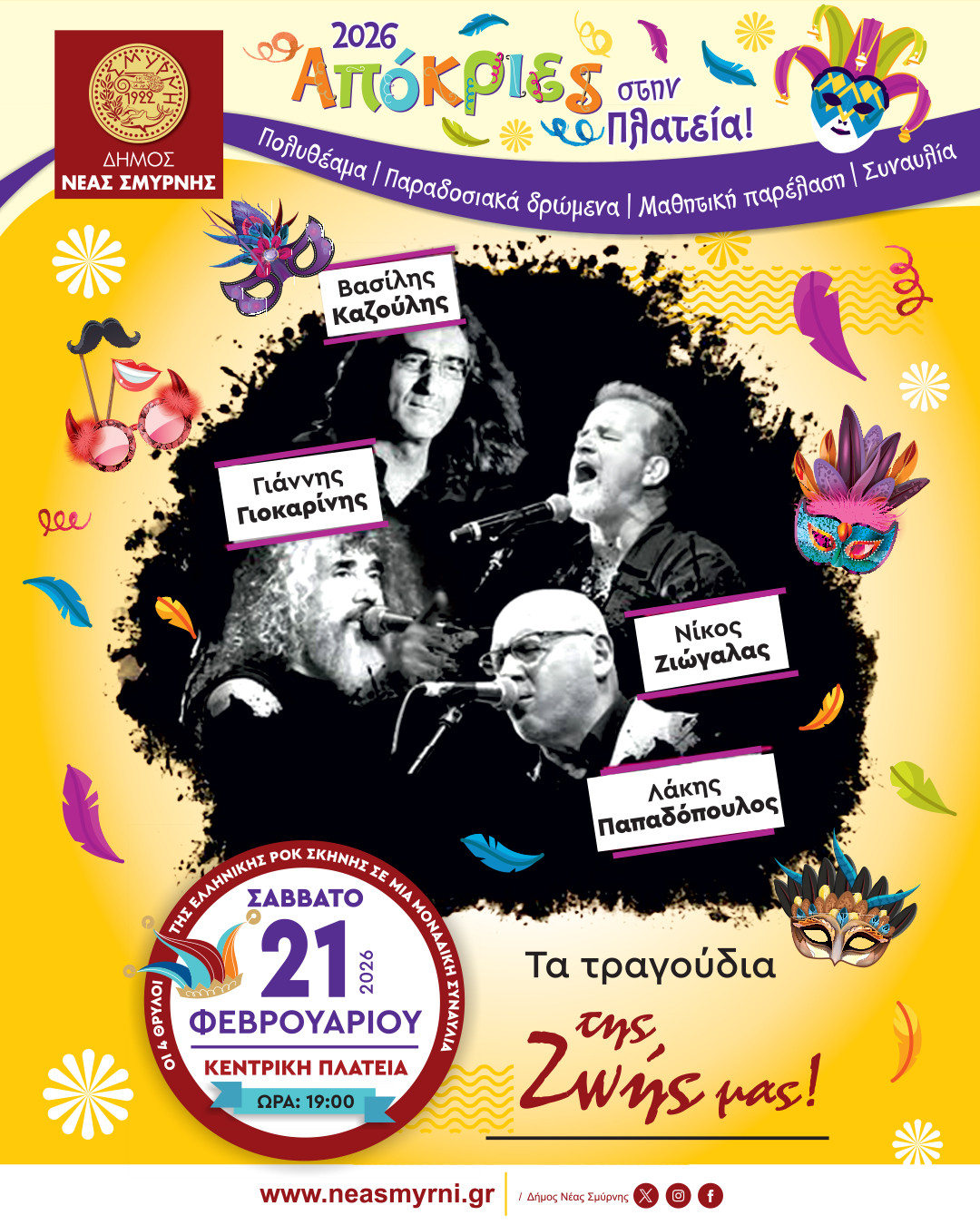 Μερικά από τα μεγαλύτερα ονόματα της Ελληνικής ροκ σκηνής ανταμώνουν το Σάββατο 21 Φεβρουαρίου στην Πλατεία στην μεγάλη Αποκριάτικη συναυλία του Δήμου Νέας Σμύρνης για να μας χαρίσουν τα αγαπημένα τους τραγούδια και πολύ κέφι!