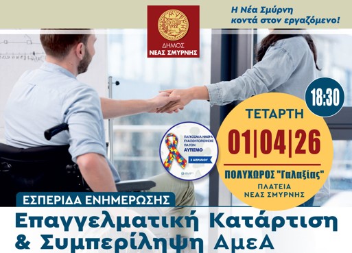 Εσπερίδα ενημέρωσης για την επαγγελματική κατάρτιση και συμπερίληψη των ΑμεαΑ διοργανώνει ο Δήμος Νέας Σμύρνης την Τετάρτη 1 Απριλίου στον δημοτικό Πολυχώρο “Γαλαξίας” με αφορμή την “Παγκόσμια Ημέρα Ευαισθητοποίησης για τον Αυτισμό” στις 2 Απριλίου.